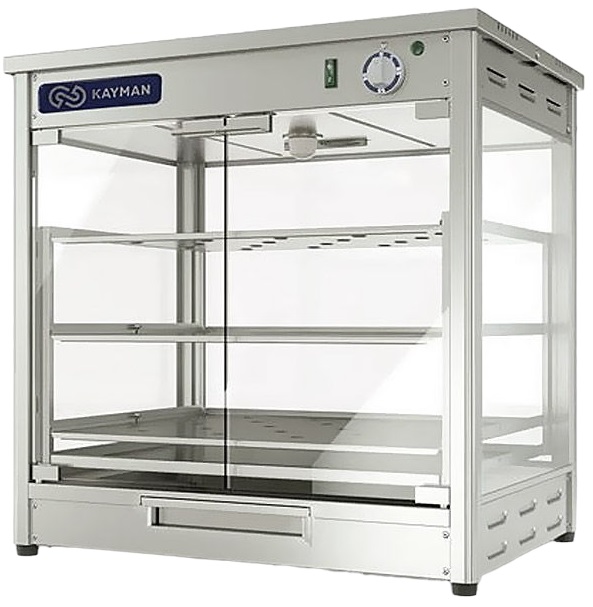 Тепловая витрина KAYMAN ВТ-01 А используется на предприятиях общественного питания, торговли и пищевых производствах для демонстрации и кратковременного хранения горячих тушек кур, вторых блюд и горячих закусок. Модель оснащена терморегулятором, полками, подсветкой, ТЭНом и поддонам для сбора жира.