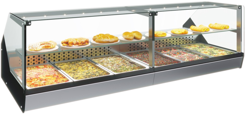 Тепловая витрина Carboma AC87 SH 1,0-11 используется в кафе, на предприятиях общественного питания, торговли и пищевых производствах для поддержания в горячем состоянии, кратковременного хранения, демонстрации и продажи различных закусок и блюд, пиццы и выпечки. Модель оборудована прямым Г-образным стеклом, ночными шторками и стеклянной полкой. Материал корпуса - сталь с ППУ-теплоизоляцией, столешницы и экспозиционной поверхности - нержавеющая сталь.