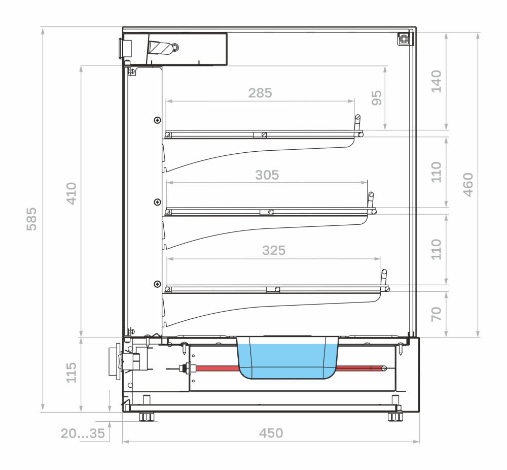 Настольная тепловая витрина Carboma AC45 HWB 0,9-1 используется на предприятиях общественного питания, торговли и пищевых производствах для продажи, демонстрации, кратковременного хранения и поддержки в горячем состоянии готовых блюд, пицц, выпечки и других изделий. Оборудование оснащено системой пароувлажнения (типа мармит), задними створками-слайдерами, полками-решетками, термометром, термостатом, гастроемкостью для воды, верхней LED-подсветкой, выдвижным поддоном для сбора крошек и регулируемыми ножками. Материал корпуса и полок - высококачественная нержавеющая сталь.