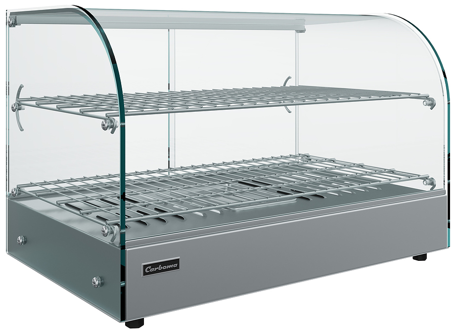Настольная тепловая витрина Carboma A36 HWB 0,6-1 используется на предприятиях общественного питания, торговли и пищевых производствах для продажи, демонстрации, кратковременного хранения и поддержки в горячем состоянии готовых блюд, пицц, выпечки и других изделий. Оборудование оснащено системой пароувлажнения (типа мармит), задними створками-слайдерами, полками-решетками, термометром, термостатом, емкостью для воды, выдвижным поддоном для сбора крошек и регулируемыми ножками. Материал корпуса и полок - высококачественная нержавеющая сталь.