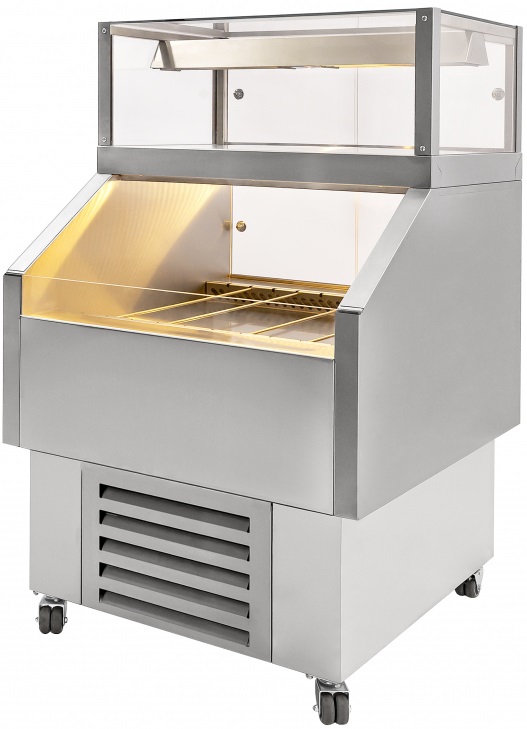 Тепловая витрина RoboLabs ПХТ-075Д используется на предприятиях общественного питания, торговли и пищевых производствах для разогрева, кратковременного хранения готовых блюд и напитков. Модель оснащена колесами диаметром 50 мм, тепловой поверхностью с нагревающими керамическими элементами, галогенновой лампой, раздвижными дверками и охлаждаемой поверхностью с ванной и разделителями, светодиодной подсветкой, раздвижными дверьми и сливным отверстием. Материал корпуса - высококачественная нержавеющая сталь AISI 430, материал нижней части - оцинкованная сталь.