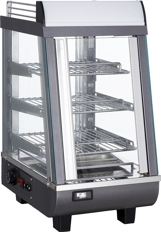 Тепловая витрина GASTRORAG RTR-76L предназначена для демонстрации, подогрева и кратковременного хранения пиццы, булочек, пирогов, различных закусок и т.д. на предприятиях общественного питания и торговли. Модель оснащена функцией увлажнения (испарение воды из ванны), раздвижными дверцами спереди и сзади, подсветкой и 3 полками-решетками. Корпус выполнен из стали, окрашенной в черный цвет.