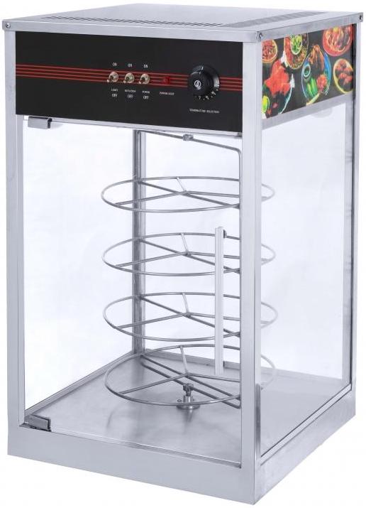 Тепловая витрина EKSI HW-815 предназначена для демонстрации, подогрева и кратковременного хранения пиццы на предприятиях общественного питания и торговли. Модель оснащена автоматически вращающимися 4 уровнями выкладки, панорамным обзором и подсветкой.