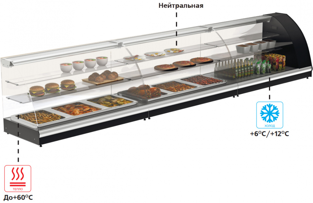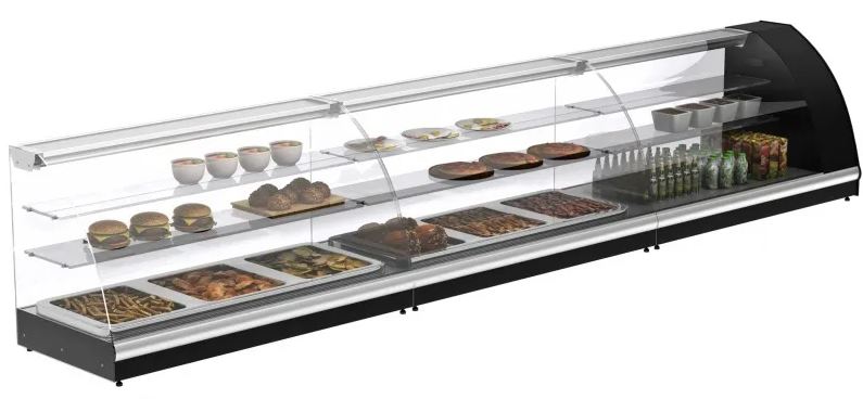 Тепловая витрина Carboma А57 SH 1,2-1 (ВТ-1,2 Арго XL) используется на предприятиях общественного питания и торговли для демонстрации и поддержания в горячем состоянии булочек, пирогов, различных закусок и готовых блюд. Модель онащена гнутым передним стеклом, 2 стеклянными полками и регулируемыми ножками высотой от 20 до 35 мм. Поверхность выкладки выполнена из золотой стали, передняя обшивка - из коричневой стали, боковины - из стекла.