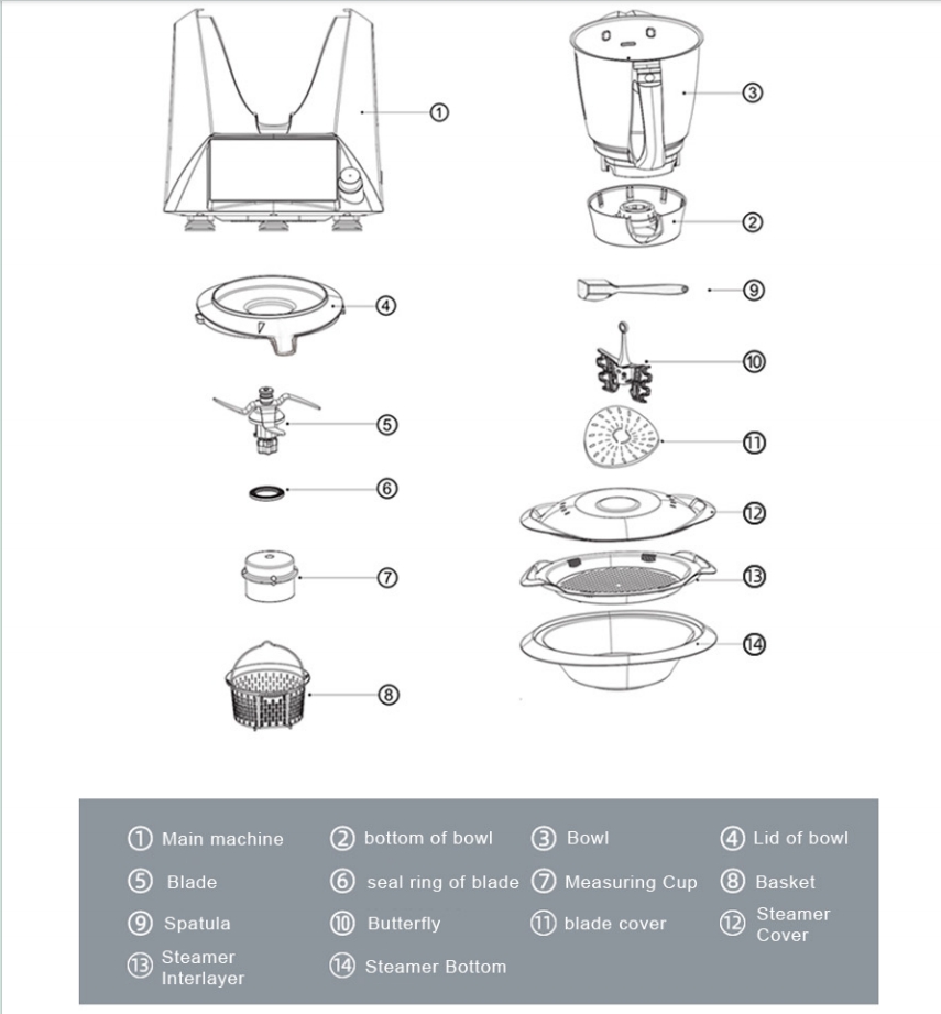 В комплекте поставки идет: база, рабочая чаша, четырехлопастной нож, лопатка-бабочка для смешивания, крышка для насадки-бабочки, корзина для продуктов, крышка емкости с мерным колпачком, пароварка, поддон для пароварки, крышка для пароварки и приставка «Варома».