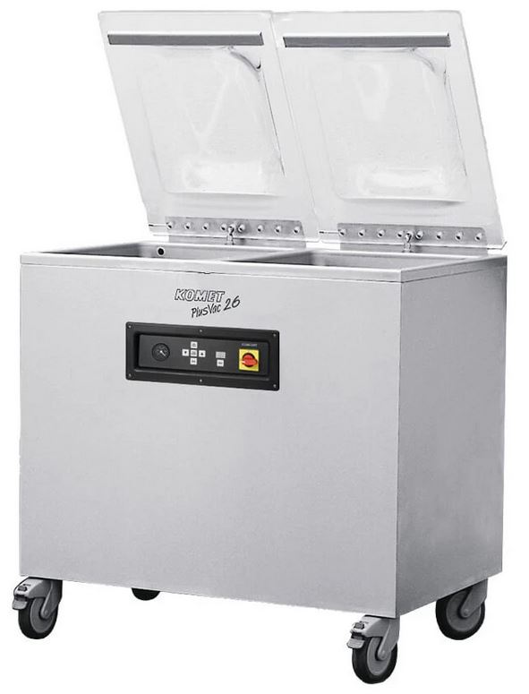 Вакуумный упаковщик KOMET PLUSVAC 26 используется предназначается для вакуумной упаковки мяса, сухофруктов, хлебобулочных изделий, гранулированных, порошкообразных и жидких продуктов на предприятиях общественного питания, торговли и пищевых производствах. Управление при помощи сенсорной панели, регулировка времени откачки воздуха и запайки. Упаковщик оснащен легкозаменяемой беспроводной запаечной планкой и заполняющими пластинами, регулирующими высоту. Материал корпуса - нержавеющая сталь, материал крышки - оргстекло.