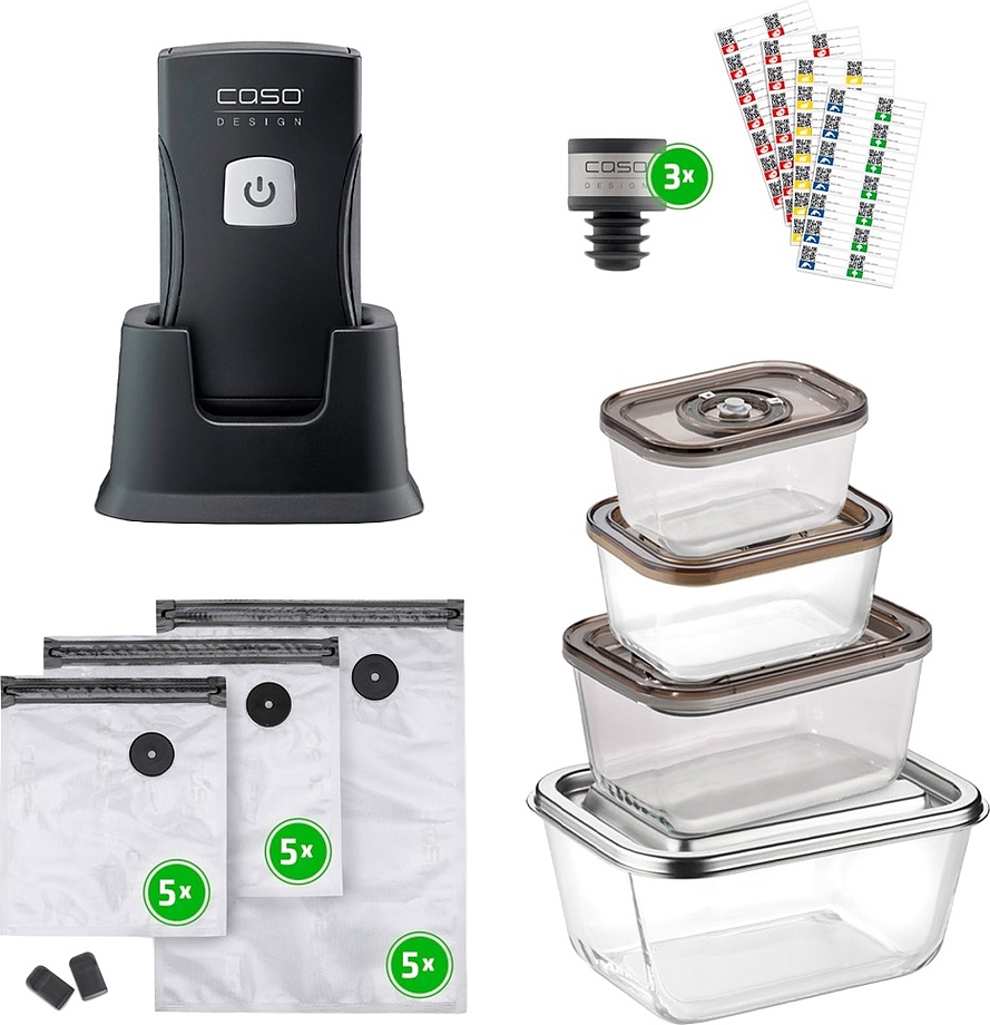 Набор CASO Vacu OneTouch Pro Set используется на предприятиях пищевой промышленности, общественного питания и торговли для герметичной упаковки полуфабрикатов и готовых блюд в пакетах или контейнерах, что способствует продлению их срока хранения. Модель с вакуумным насосом и литий-ионным аккумулятором. Материал корпуса вакууматора - пластик, материал контейнеров - стекло.